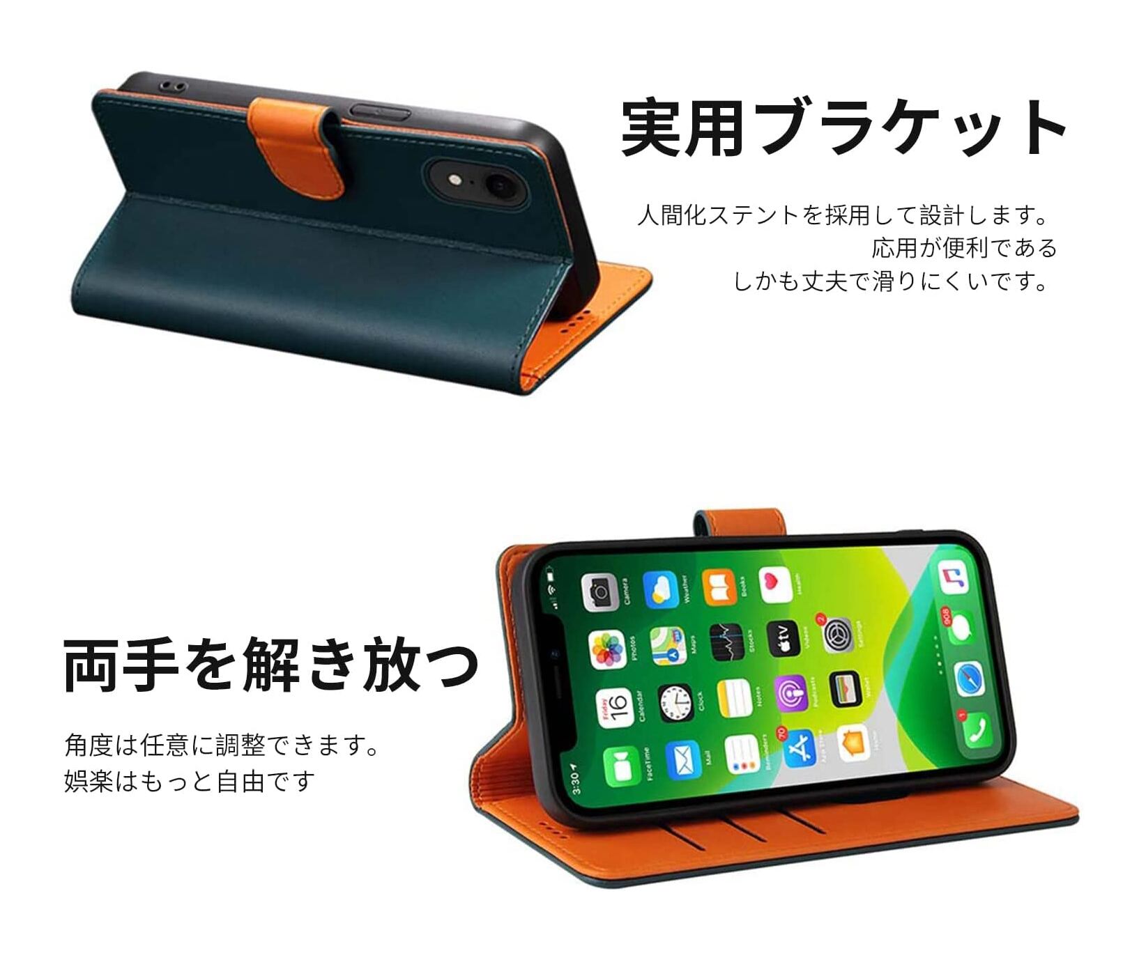 521.iPhoneX/Xsケース 手帳型 マグネット式 手触りが良い グリーン 520