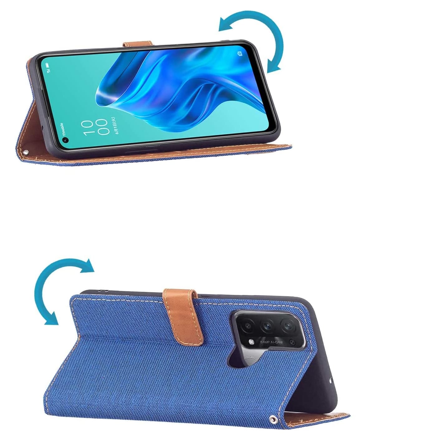 527.OPPOReno5Aケース 手帳型 デニムデザイン 全面保護 ブルー 527